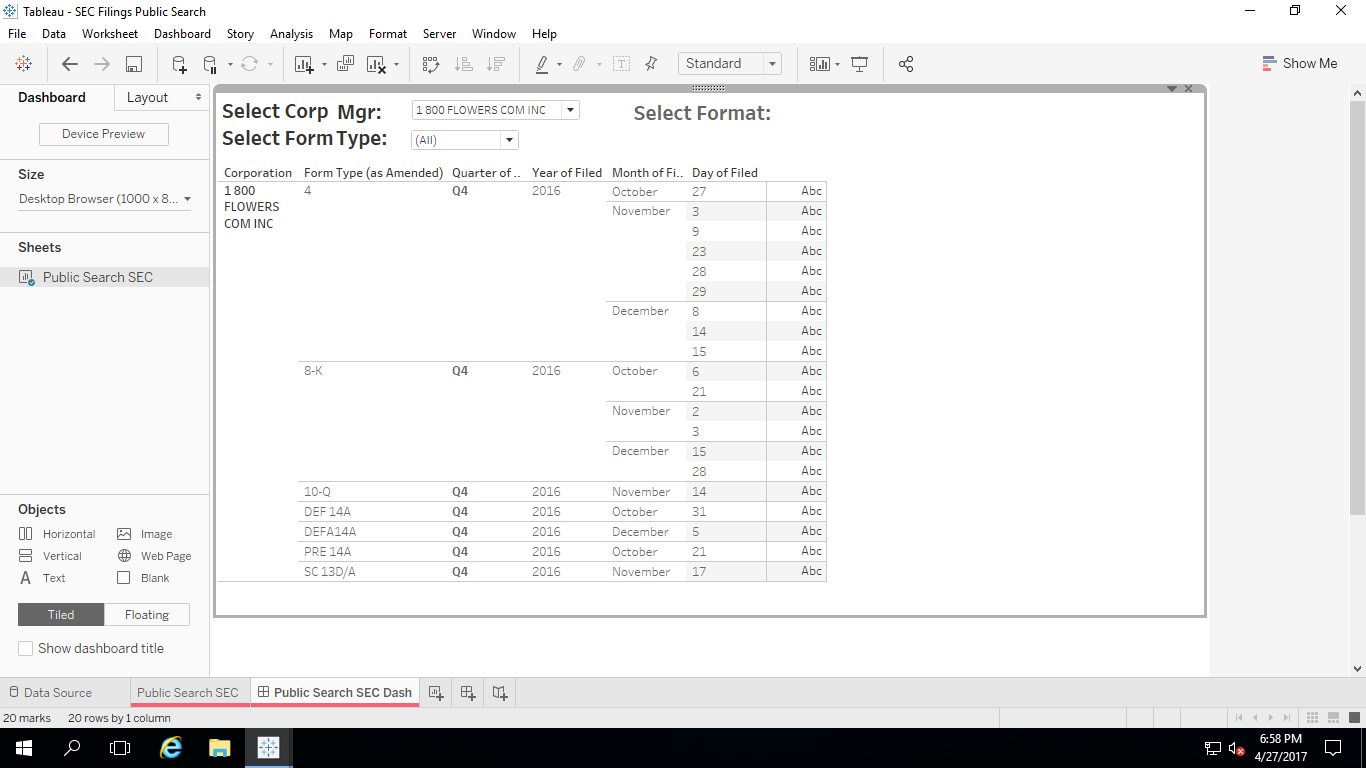 Submissions differentiated by Form Type sorts, Date Filed, Investment Manager, File Name (hidden), CIK (hidden) Public Dash as a source document and in sets curated for Analytics: